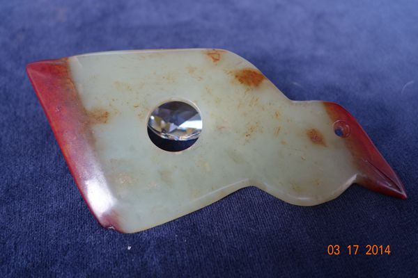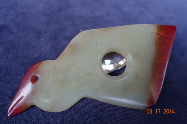 E2 年代: 西周 品名: 玉鳥珮 玉料: 和闐青玉 規格(寬×高×厚-公分): 9×10.8×0.4