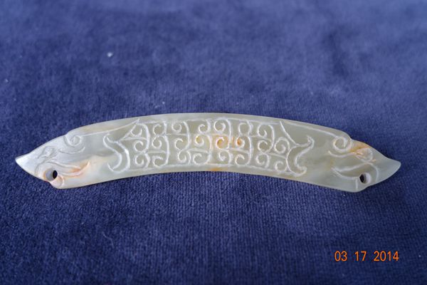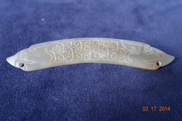 E7 年代: 西周 品名: 玉璜 玉料: 青玉 規格(寬×高×厚-公分): 10×2×0.3