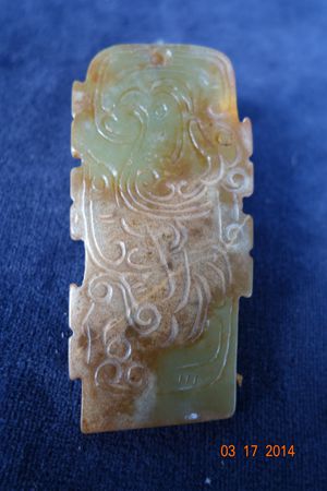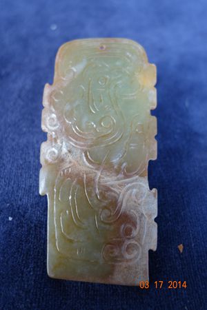 E10 年代: 西周 品名: 鳳珮 玉料: 青玉 規格(寬×高×厚-公分): 3.5×7×0.3