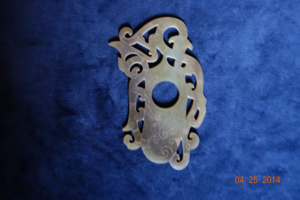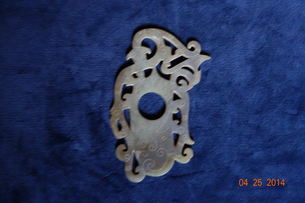 E13 年代: 西周 品名: 龍鳳璧 玉料: 和闐青玉 規格(寬×高×厚-公分): 7.5×11.5×0.3