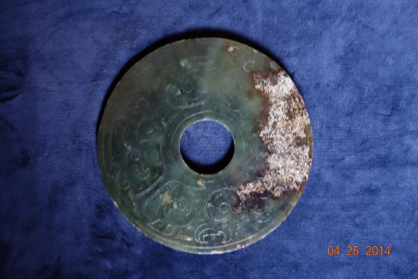 E16 年代: 西周 品名: 玉璧 玉料: 和闐青玉 規格(寬×高×厚-公分): Ø 14.5×0.5