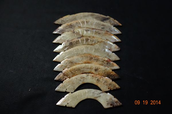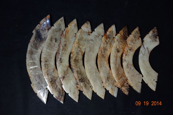 E21 年代: 西周 品名: 玉璜 玉料: 黃玉(共9片)規格(寬×高×厚-公分):23×7×0.3~10×3.5×0.3 (九璜一套)