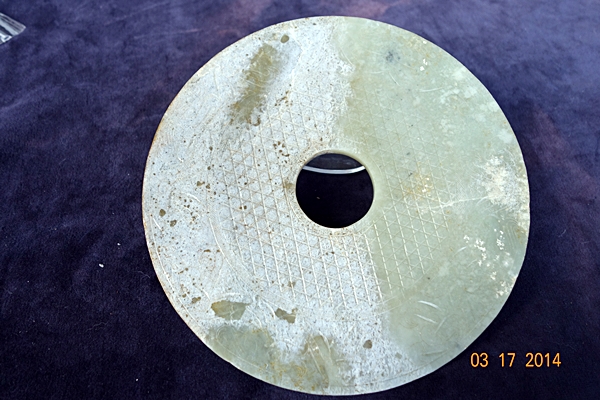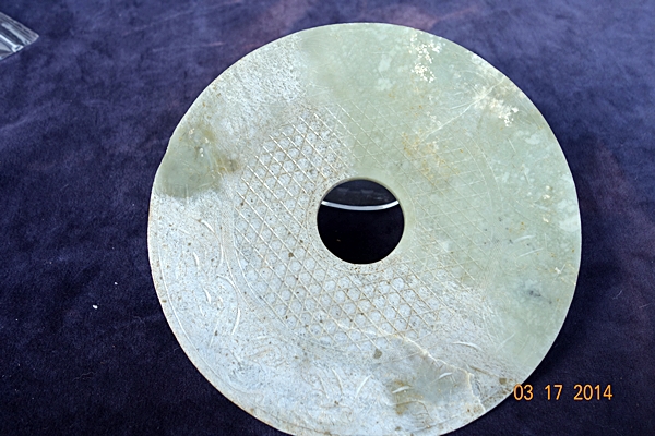 G6 年代: 戰國時代 品名: 玉璧 玉料: 和闐青玉 規格(寬×高×厚-公分): Ø 28×0.5