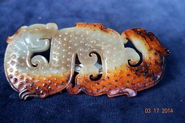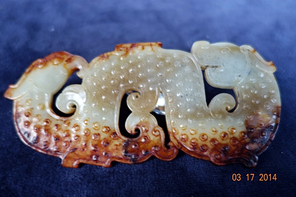 G13 年代: 戰國時代 品名: 龍鳳珮 玉料: 和闐青玉 規格(寬×高×厚-公分): 5.5×11.5×0.6