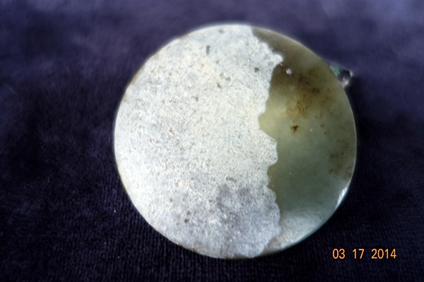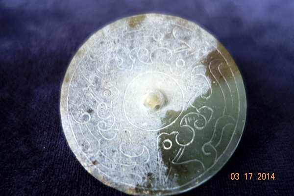 G17 年代: 戰國時代 品名: 玉鏡 玉料: 青玉 規格(寬×高×厚-公分): Ø 5.5×0.3