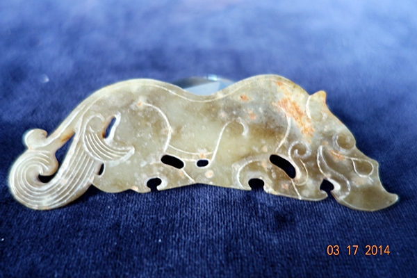 G21 年代: 戰國時代 品名: 玉虎 玉料: 和闐青玉 規格(寬×高×厚-公分): 9.5×3.4×0.3