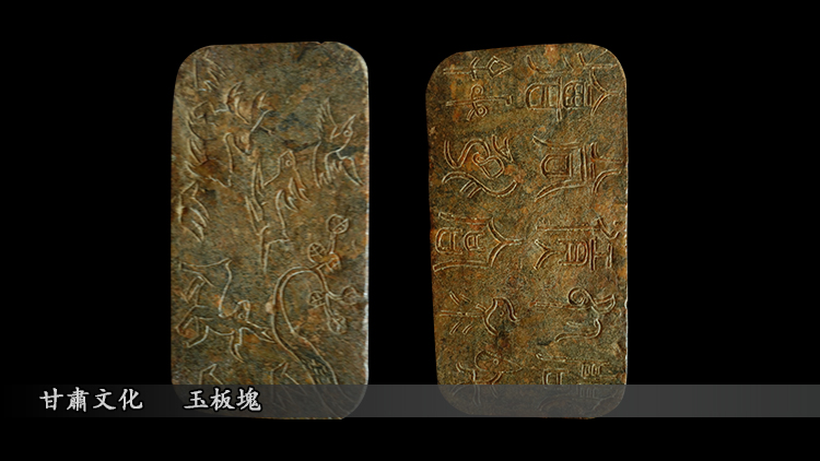 甘肅文化玉器至今已有五千多年歷史,在未發現此件玉板塊前,很難相信史前文化的琢玉技術,已能達到減地雕法的工藝,我想目前中國玉器陽雕之始,應屬甘肅玉雕為最。甘肅文化之玉器,出土較為稀少,此塊玉板塊同時出土的尚有數十件的同類物件。其前雕狩獵圖,後刻有古文字,像是描述一種故事,栩栩如生,是典型的甘肅文化圖騰。其雕工精緻,線條流暢,甚稱難得的文物寶藏。